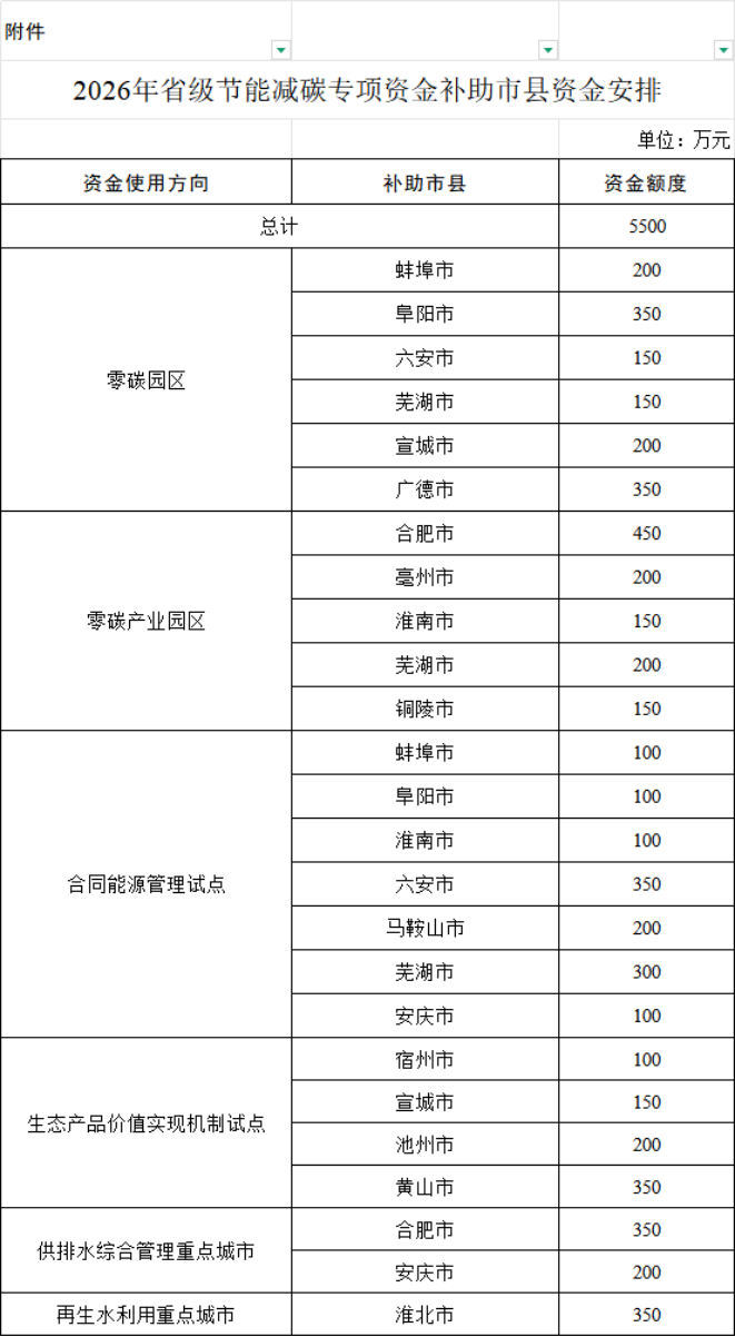 補(bǔ)貼政策補(bǔ)助超五千萬!安徽2026年省級(jí)節(jié)能減碳專項(xiàng)資金補(bǔ)助市縣資金安排公示