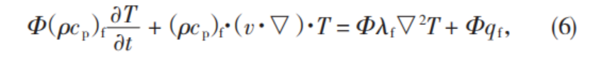 兩種能量增加帶來(lái)的溫升是基于多孔介質(zhì)材料內(nèi)的固體部分。假設(shè)固體部分的密度表示為ρs,其比熱容表示為cs。假定研究對(duì)象熱物性參數(shù),如比熱容、導(dǎo)熱系數(shù)等,不受到時(shí)間和空間改變帶來(lái)的影響,多孔介質(zhì)本身始終為各項(xiàng)同性的,并且多孔介質(zhì)材料內(nèi)部細(xì)小孔隙的容積均被流體填充,則有: