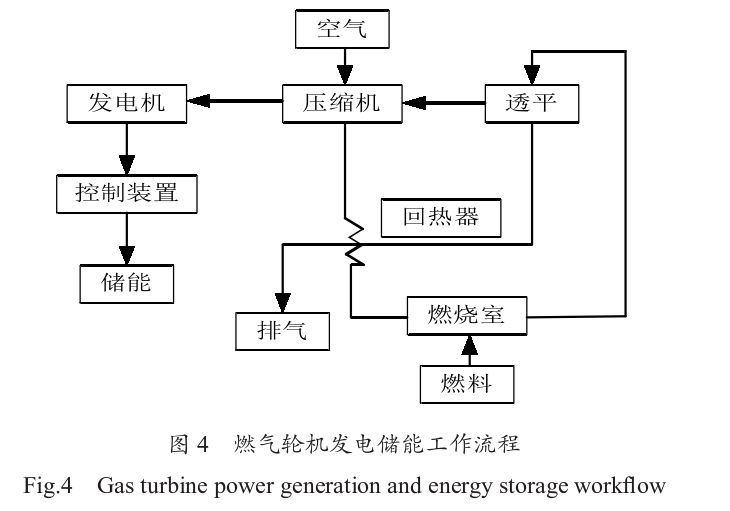燃氣輪機發(fā)電儲能是通過燃料供給系統(tǒng)將天然氣輸送到燃燒室。天然氣在燃燒室內與空氣混合燃燒,產生高溫高壓的燃氣。這些高溫高壓的燃氣迅速膨脹,并流經透平葉片, 推動透平旋轉。透平葉片通過軸連接到發(fā)電機,透平的旋轉帶動發(fā)電機的轉子旋轉,從而在定子中產生電流,完成電能的轉換。最終將電能儲存到儲能系統(tǒng)中,以便在電力需求高峰期或電網出現(xiàn)故障時進行釋放和使用。如圖4所示。在燃氣輪機發(fā)電儲能過程中,儲能系統(tǒng)可以幫助平衡燃氣輪機發(fā)電的輸出波動。燃氣輪機的啟動和停止時間較長,且燃料燃燒效率和發(fā)電效率容易受環(huán)境溫度和負荷變化的影響。通過儲能系統(tǒng)的調節(jié),可以在短時間內補償輸出功率的波動,確保電網的穩(wěn)定運行。在負荷較低時,燃氣輪機的效率較低, 部分燃料會被浪費。儲能系統(tǒng)可以在這種情況下存儲多余的電能,并在電力需求高峰期釋放,減少燃氣輪機的啟動和停止次數(shù),從而提高整體的能源利用效率。