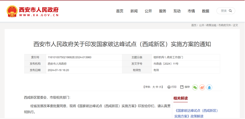 7月19日,西安市人民政府面向西咸新區(qū)管委會,市級相關部門印發(fā)《國家碳達峰試點(西咸新區(qū))實施方案》,聚焦綠色低碳發(fā)展的能源和產(chǎn)業(yè)轉型瓶頸制約,加快提升能源清潔化利用效率、基礎設施綠色低碳化水平和減污降碳協(xié)同能力,全面推動產(chǎn)業(yè)高質量發(fā)展和資源循環(huán)利用。