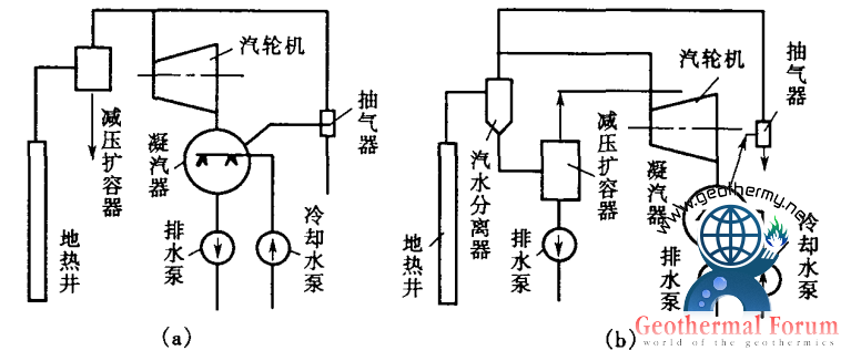閃蒸地?zé)岚l(fā)電系統(tǒng)是一種比較適用于中低溫地?zé)崴?/a>發(fā)電的系統(tǒng)(又稱“減壓擴(kuò)容法”),圖1所示為這種系統(tǒng)的流程圖。來自地?zé)峋?/a>的熱水首先進(jìn)入閃蒸器(減壓擴(kuò)容器)(圖1-a),容器內(nèi)維持著比熱水壓力低的壓力,因而部分熱水得以閃蒸并將產(chǎn)生的蒸氣送往汽輪機(jī)膨脹做功發(fā)電。如地?zé)峋?/a>口流體是濕蒸氣(圖1-b),則先進(jìn)入汽水分離器,分離出的蒸氣送往汽輪機(jī)做功發(fā)電,分離剩余的水再進(jìn)入閃蒸器,閃蒸后得到的閃蒸蒸氣也送往汽輪機(jī)做功。