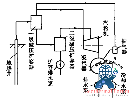 圖2是多級閃蒸(多級減壓擴(kuò)容)蒸氣循環(huán)的流程圖。從井口流出的熱水先進(jìn)入第一級減壓擴(kuò)容器,產(chǎn)生的蒸氣進(jìn)入汽輪機(jī)的高壓部分,而從第一級閃蒸器底部出來的閃蒸后的剩余熱水再進(jìn)入第二級閃蒸器(擴(kuò)容器),產(chǎn)生二次閃蒸蒸氣,并通往汽輪機(jī)低壓部分做功。若井口出來的是濕蒸氣,則直接進(jìn)入汽水分離器,蒸氣分離出來后去高壓部分做功,熱水再進(jìn)入第二級閃蒸器(減壓擴(kuò)容器),所以實(shí)際上是用一個(gè)汽水分離器代替了第一級閃蒸器,如(圖1-b)所示。第二級閃蒸器分離出來的熱水壓力若高于大氣壓力,則熱水可以自行排出;不然,就要用排水泵抽出。閃蒸器的級數(shù)增加,單位質(zhì)量工質(zhì)輸出功也增加,即地?zé)崴?/a>中的能量愈能得到充分利用。當(dāng)級數(shù)無限多時(shí),理論上可以得到最大的輸出功,增益達(dá)到極限。但是,級數(shù)增加將使設(shè)備投資增加,系統(tǒng)變得復(fù)雜,所以實(shí)際采用的閃蒸級數(shù)一般不超過四級。地?zé)崃黧w溫度高可以級數(shù)多些,熱水溫度較低時(shí)就不宜采用二級以上的閃蒸系統(tǒng)。