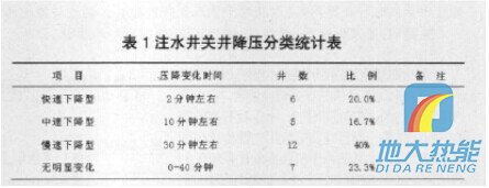 為確定合理降壓時(shí)間,在我隊(duì)30口注水井洗井過程中觀察注水井壓力隨關(guān)井時(shí)間的變化,以短時(shí)間(60分鐘)壓力出現(xiàn)直線段或相對(duì)直線段統(tǒng)計(jì),歸納總結(jié)如表1所示的幾種類型:快速下降型、中速下降型、慢速下降型、無明顯變化型。 根據(jù)調(diào)查統(tǒng)計(jì)結(jié)果,來確定不同類型的關(guān)井降壓時(shí)間:快速下降型的井只需關(guān)井3 ̄5分鐘;中速下降型的注水井需關(guān)井10 ̄15分鐘;慢速下降型的注水井需關(guān)井降壓30分鐘,無明顯變化型的注水井可直接洗井(洗井時(shí)應(yīng)觀察壓降的變化)。為此關(guān)井降壓的最佳時(shí)間應(yīng)該是壓降變化趨于穩(wěn)定的時(shí)間,較為合理。