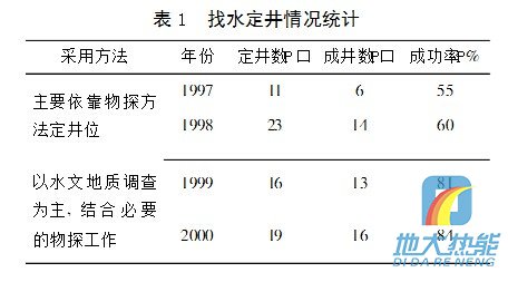 前幾年某單位在水文地質(zhì)領(lǐng)域剛起步,經(jīng)驗不足,找水主要依靠物探工作,片面追求效率,急于求成,效果很不理想。后來意識到了基巖裂隙水地區(qū)水文地質(zhì)調(diào)查工作的重要性,及時調(diào)整了思路,加強(qiáng)了這方面的工作力度,取得了比較好的結(jié)果。近幾年來基巖裂隙水地區(qū)定井成功率見表1。