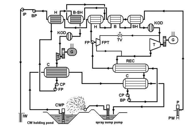 起初的電站使用的就是普通的雙循環(huán)地熱發(fā)電流程的機組。在優(yōu)化了1979年開始使用的發(fā)電機組以后,修整后的地熱電站是一個完全不同的發(fā)電機組。以前的主渦輪機、真回流熱電轉(zhuǎn)換器、和交互蘭金循環(huán)都被還掉了。取而代之的是,一個簡單的,非提取異丁烷渦輪,和九個更大的鹵水熱電交換機。在熱電交換機的管道所在的一邊是鹵水,在殼側(cè)是碳水化合物。驅(qū)動沸騰給水渦輪的異丁烷來自于一個單獨的過熱器的側(cè)流。發(fā)電系統(tǒng)上安裝了一個降壓閥,來降低異丁烷的壓力以適應BFPT的注入壓力。換熱器沒有更換,但是現(xiàn)在只是作為一個異丁烷循環(huán)的預熱器。丙烷循環(huán)現(xiàn)在也已經(jīng)獨立于異丁烷循環(huán)。