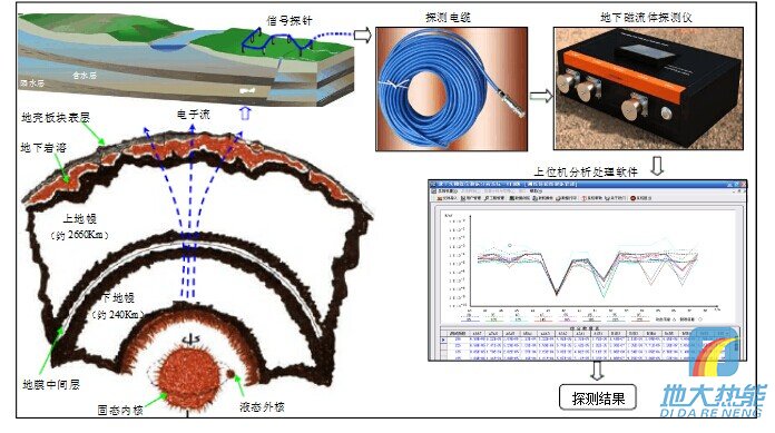 1、探測(cè)原理 UMF-Y05型探測(cè)系統(tǒng)是在地表通過(guò)探針接收來(lái)至地球內(nèi)部的地下磁流體電磁波,經(jīng)探測(cè)電纜到地下磁流體探測(cè)儀,由探測(cè)儀提取特征信息并送上位機(jī)綜合分析得出探測(cè)結(jié)果。